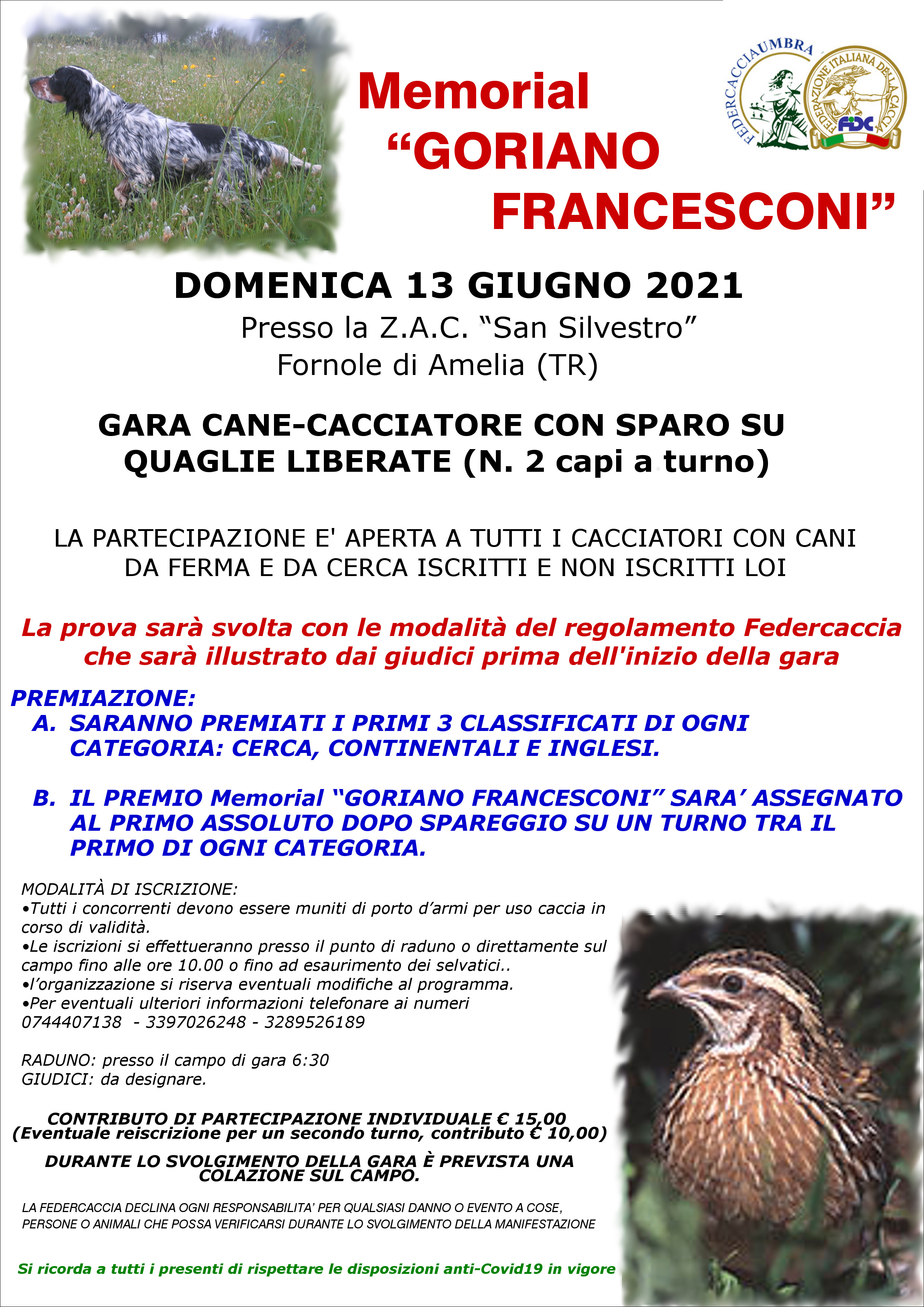 Durante lo svolgimento della manifestazione è stata offerta dalla sezione Federcaccia provinciale di terni una ricca colazione. La gara con inizio alle 6.30 si è conclusa con il barrage finale riservato al vincitore di ogni singola categoria, per l’assegnazione del trofeo Goriano Francesconi.
